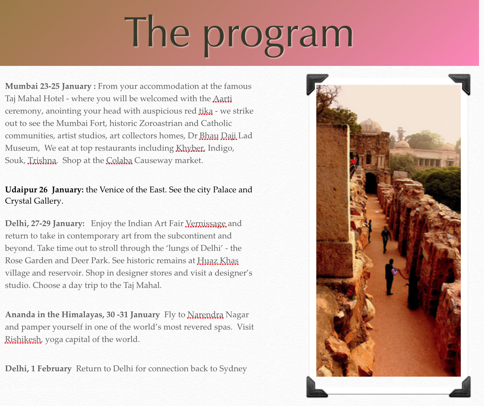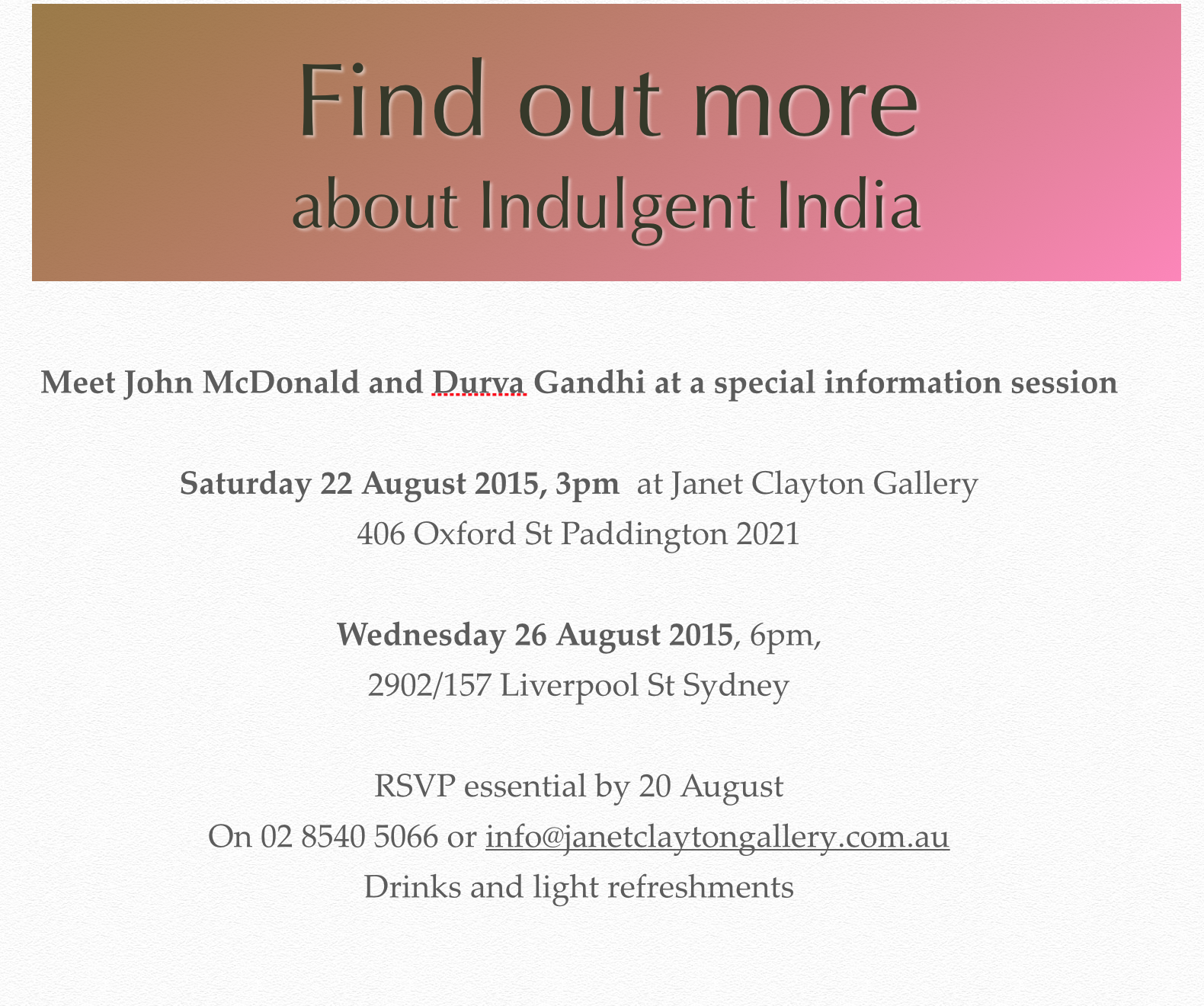 Travel to Indulgent India with John McDonald and Durva Ghandi: 23 January - 1 February 2016 Janet Clayton6 August 2015Comment Facebook0 Twitter Pinterest0 0 Likes