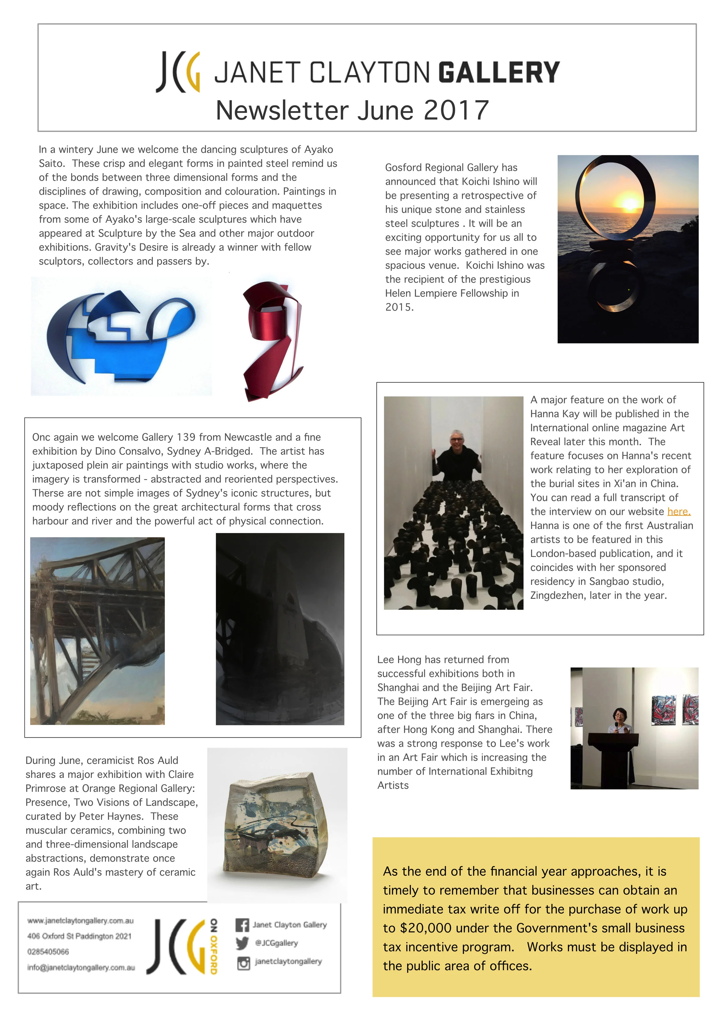 Newsletter June 2017 Newsletter, Artist News, 2017, CurrentJanet Clayton8 June 2017Hanna Kay, Lee Hong, Ros Auld, Koichi Ishino, Ayako Saito, JuneComment Facebook0 Twitter Pinterest0 0 Likes